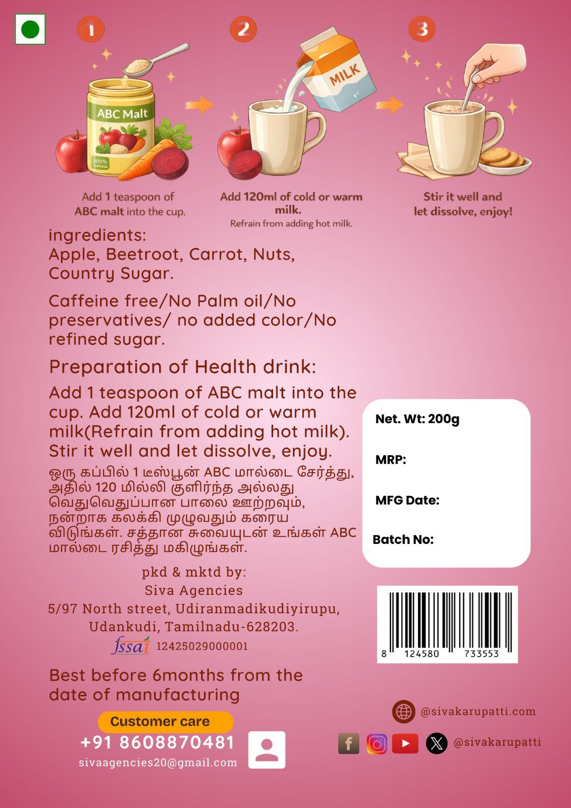 add 1teaspoon of ABC malt into the cup, add 120ml of cold or warm milk (Refrain from adding hot milk)stir it well and let dissolve, Enjoy
