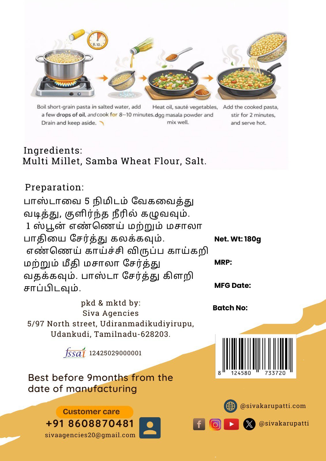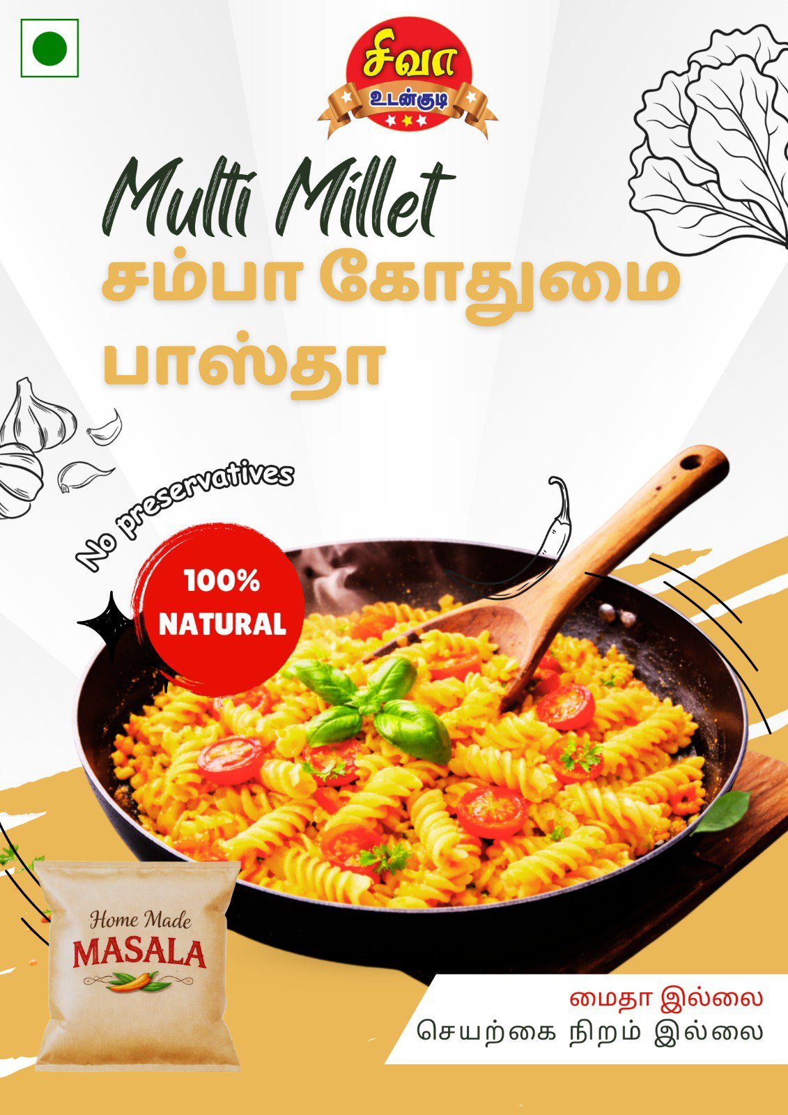 பாஸ்தா 5நிமிடம் வேகவைத்து வடித்து,குளிர்ந்த நீரில் கழுவவும் 1 ஸ்பூன் எண்ணெய் மற்றும் மசாலா பாதியை சேர்த்து கலக்கவும் என்னை காய்ச்சி விருப்ப காய்கறி மற்றும் மீதி மசாலாவை சேர்த்து வதக்கவும்.பாஸ்தா சேர்த்து கிளறி சாப்பிடவும்.